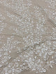 This embellished tulle features an all-over modern design of embroidery with clear sequins akin to a feather look. It has a soft drape and is ideal for use in bridal, evening or christening wear.